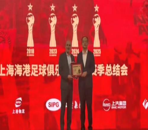 老帅和众弟子背后是主台的屏幕,上方赫然印着10个大字,写着:海港三连冠,四星耀申城。众所周知,本赛季夺取中超冠军后,海港完成连续3年夺冠的”伟业“,让俱乐部队史的中超冠军数量达到4个。如此荣誉的时刻,让上港人倍感自豪。