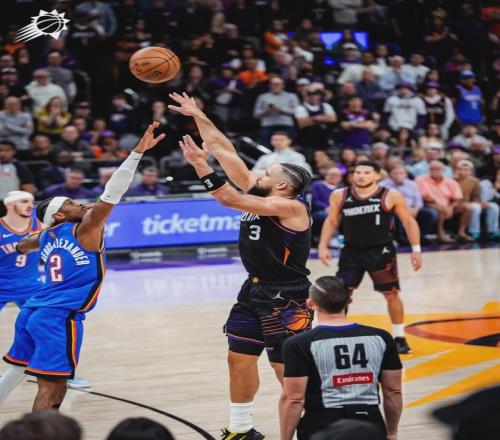 雷霆最后一投三不沾,最终3分惜败。最近7场比赛,太阳6胜1负,只在客场113-129输给了骑士。今天布克首发出战38分钟,投篮11中5,三分4中1,罚球15中13,得到24分6篮板9助攻1失误3犯规,正负值+11全场第二高。